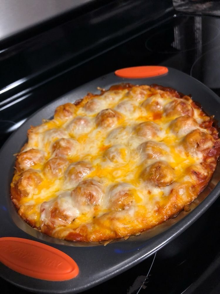 • In a large baking dish, mix cooked spaghetti, marinara sauce, and meatballs
