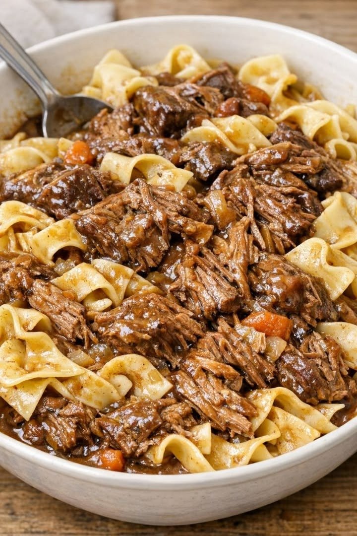 Here’s a comforting, classic Beef and Noodles recipe—tender beef in a savory gravy served over soft egg noodles.