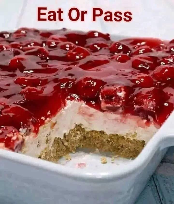 - A no-bake or semi-baked dessert with layers: usually a cookie or graham cracker crust, cream filling, and cherry topping.