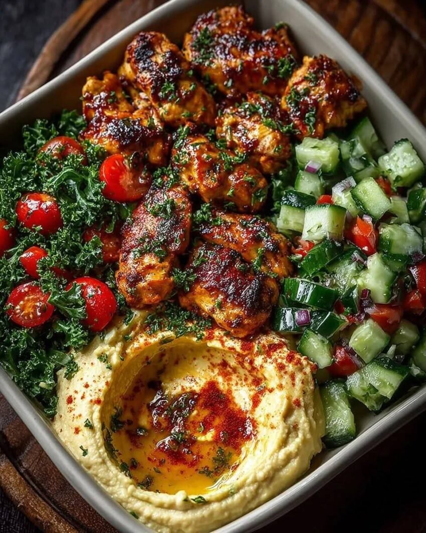 A delicious Mediterranean-inspired meal with juicy grilled chicken skewers, creamy hummus, and soft pita bread. Perfect for a healthy lunch or dinner.