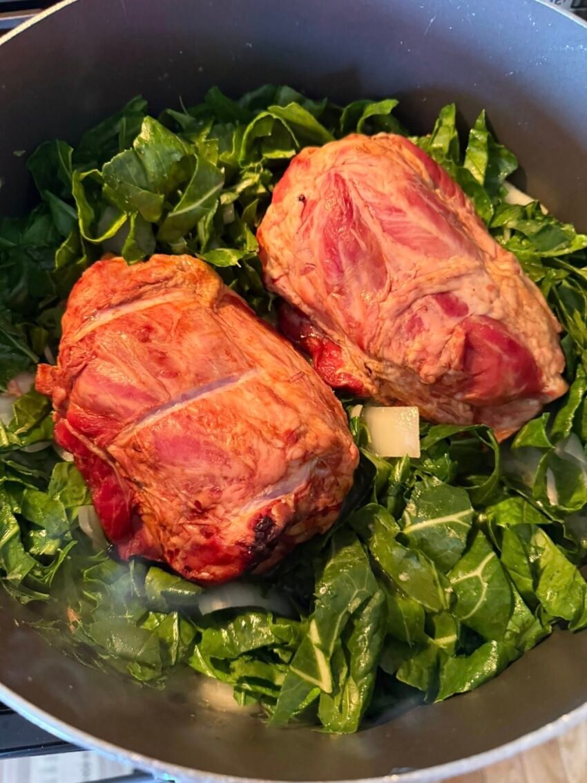 Add broth, black pepper, and red pepper. Cover and simmer 45–60 minutes so the meat seasons the liquid. - Add collards