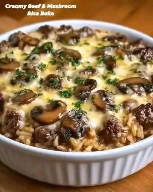 A comforting, all-in-one casserole with tender beef, earthy mushrooms, creamy sauce, and fluffy rice — perfect for an easy weeknight dinner.