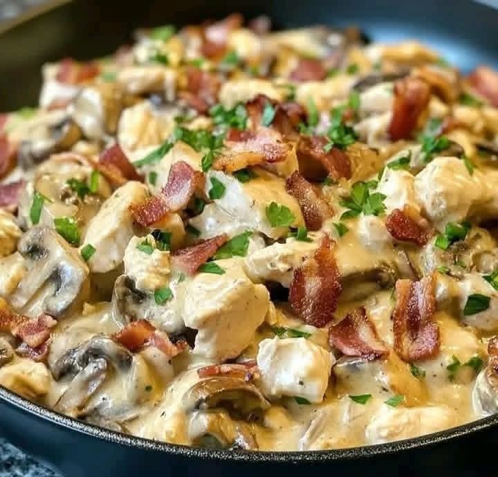 Here’s a rich, creamy chicken stroganoff with bacon & mushrooms — comforting and easy to make 🍄🥓
