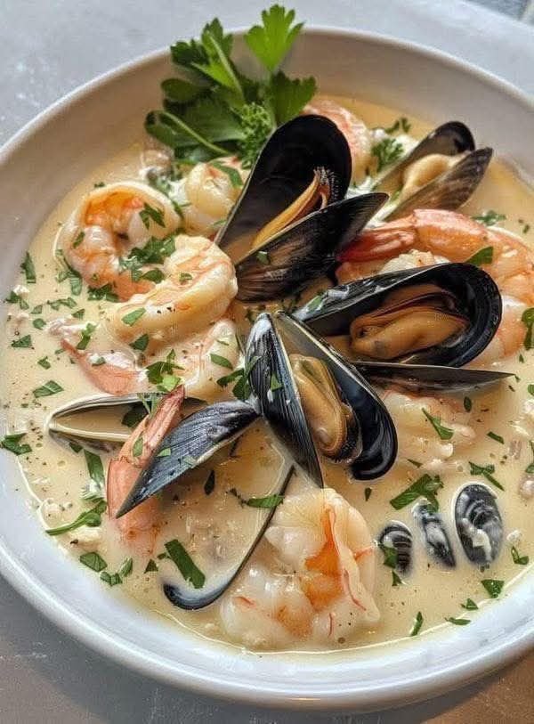 Here’s a comforting creamy seafood stew with clams, cod, and shrimp—rich, slightly briny, and perfect with crusty bread. 🥖🦐