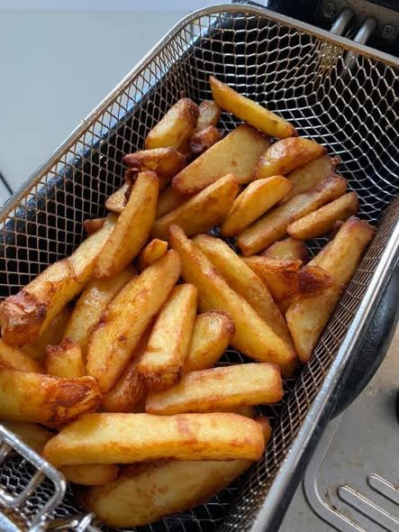 - Fry potatoes in batches 3–5 minutes until golden.