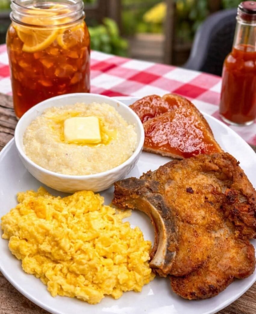 - Plate pork chops with a side of mashed potatoes and scrambled eggs.
