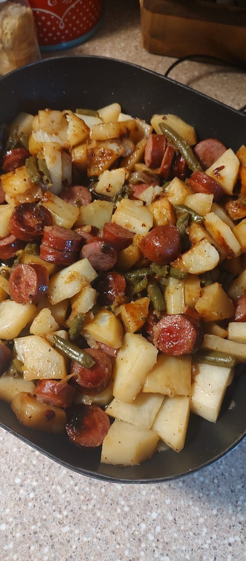 Fried Potatoes, Onions, Smoked Sausage & Green Beans