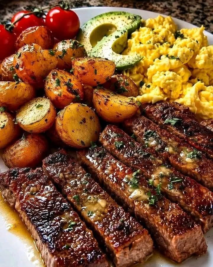 🥩🧄 Garlic Butter Steak with Roasted Potatoes & Fluffy Scrambled Eggs