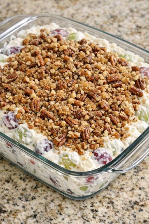 Grandpa Tom’s Grape Freezer Salad 🍇❄️ is an old-fashioned frozen dessert salad often served at family gatherings. It’s creamy, sweet, and sliced into squares after freezing.