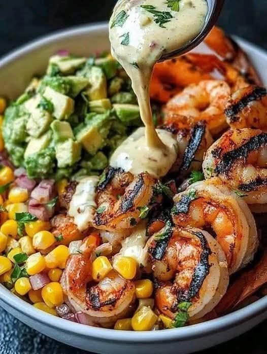 🍤 Grilled Shrimp Bowl with Avocado Corn Salsa and Creamy Sauce