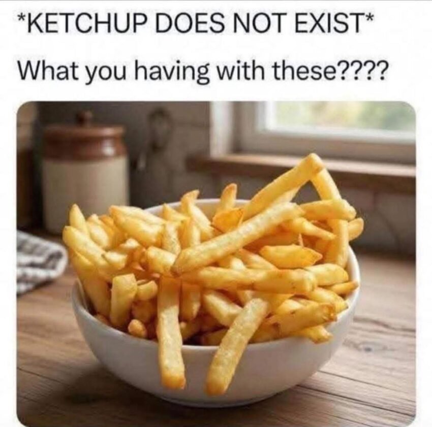 …implying that if ketchup “doesn’t exist,” then something else must be used to eat fries. (TwStalker) - The humor comes from the absurdity — it’s a silly, intentionally illogical premise that takes a mundane thing (ketchup) and denies its existence as a playful “what if.” (verbub.com)