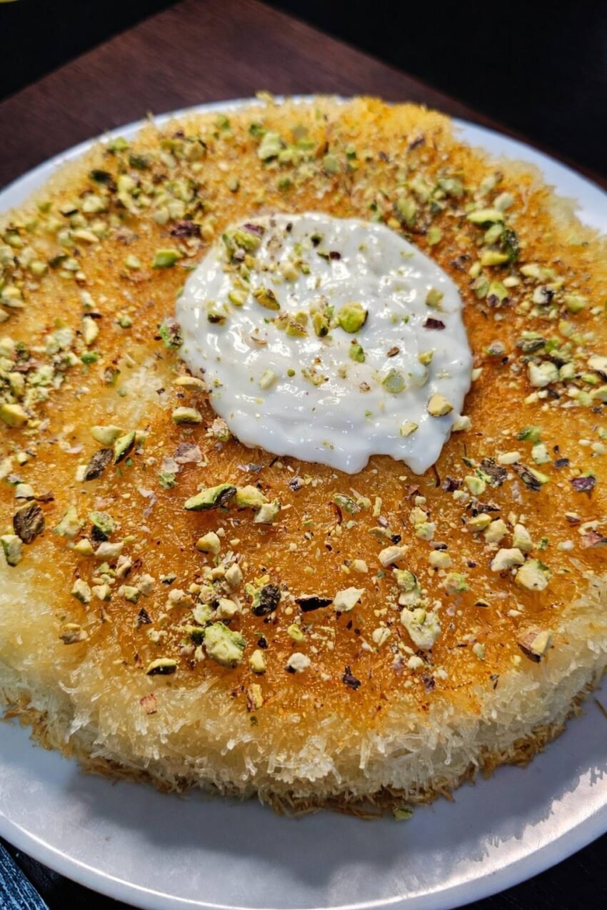Knafeh is a dessert made from shredded phyllo dough (or kataifi), layered with sweet cheese (like Nabulsi or mozzarella), baked until golden, and soaked in fragrant sugar syrup. It’s often garnished with pistachios.