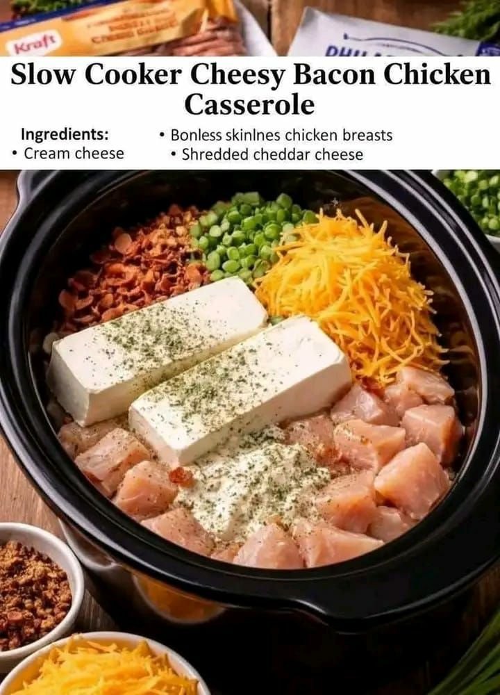 Here’s a simple Slow Cooker Cheesy Bacon Chicken–style recipe you can make at home — a rich, creamy chicken dish with melting cheese and bacon cooked low and slow. This is similar to popular slow‑cooker chicken & bacon recipes you’ll find online (e.g., cheesy ranch chicken versions). (Umami)