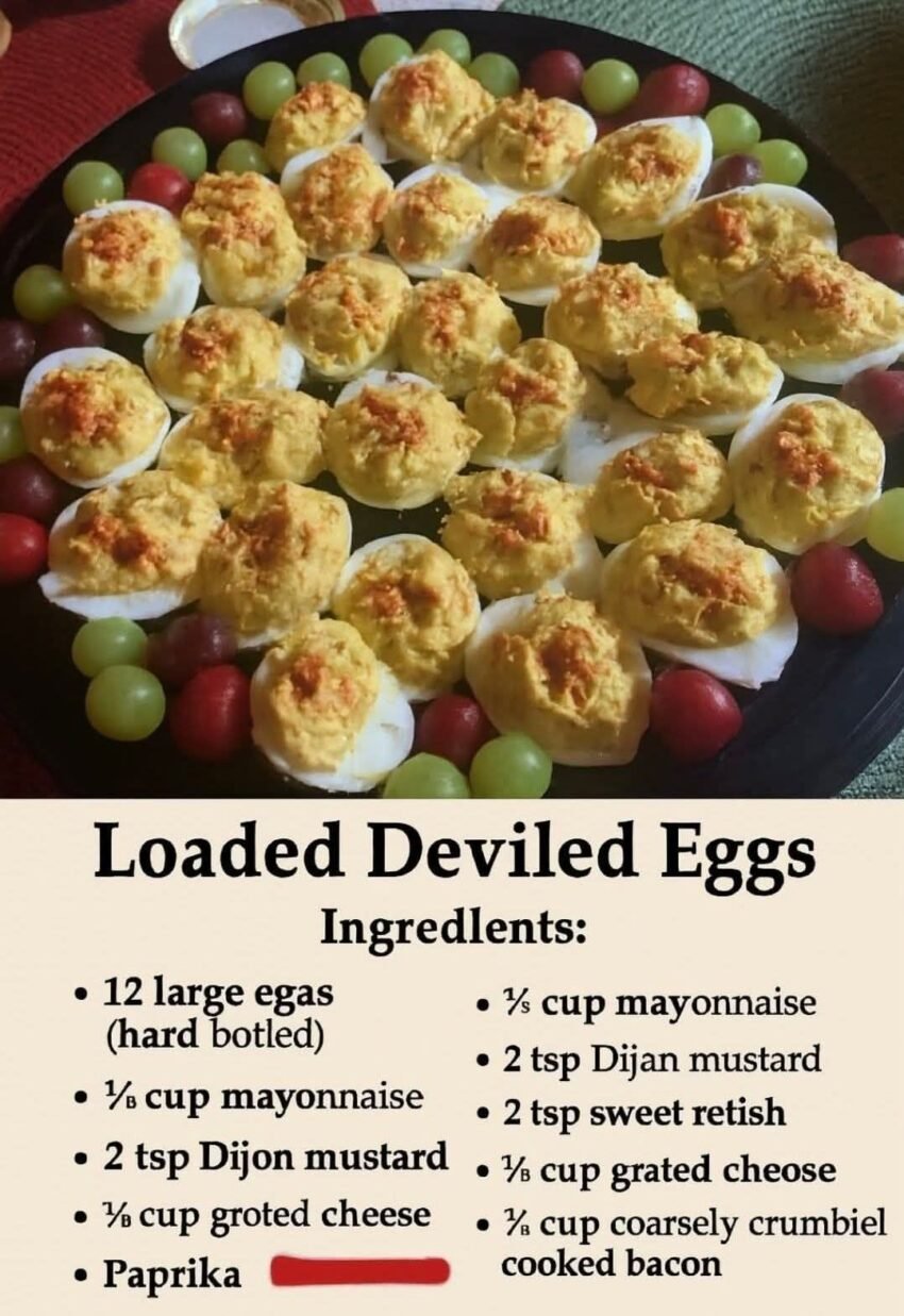 Here’s a flavorful twist on classic deviled eggs: Loaded Deviled Eggs — creamy, savory, and topped with all your favorite extras. 🥚✨