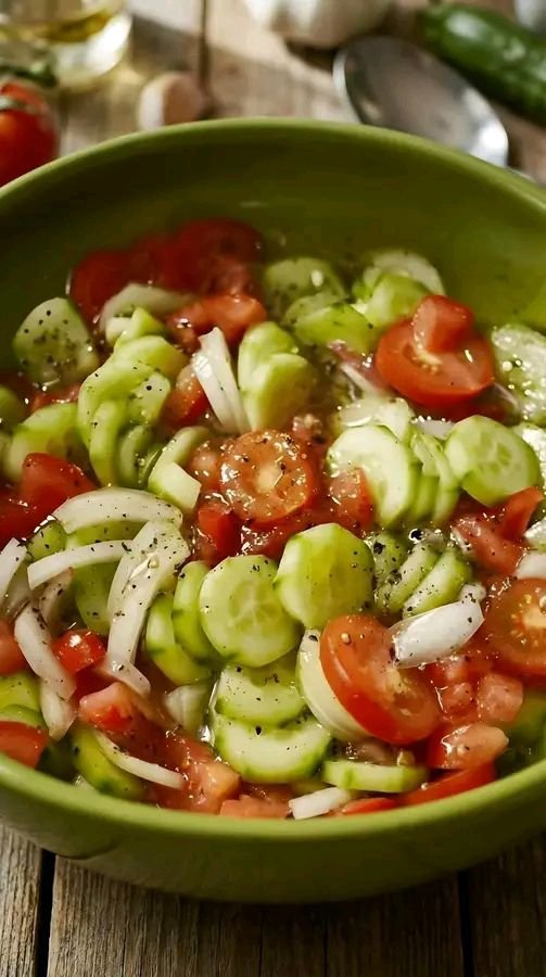 Here’s a simple and refreshing recipe for a Marinated Cucumber, Onion, and Tomato Salad: