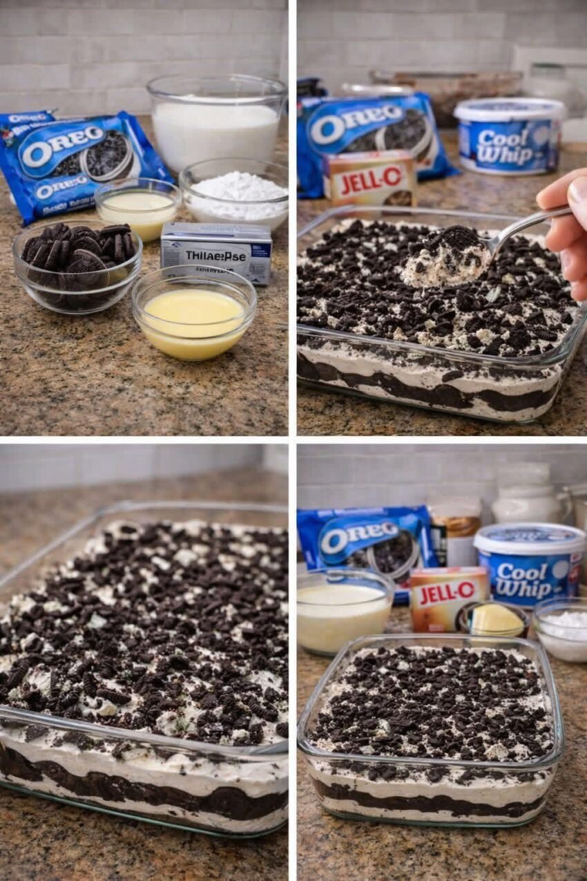 It looks like you’re describing a dessert that sounds like a layered Oreo pudding or “No-Bake Oreo Jello & Cool Whip Dessert”—a creamy, chocolatey treat with layers of cookies, pudding, and whipped topping. Here’s a simple version you can make at home: