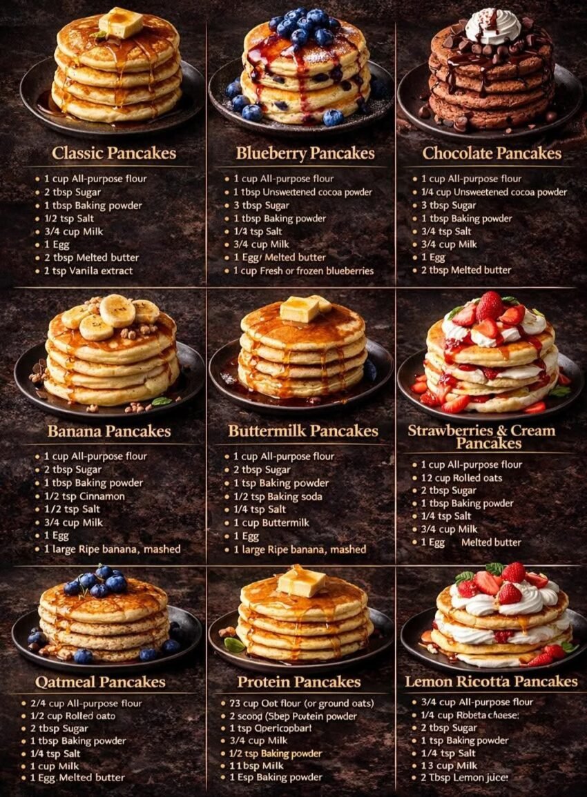 Here’s a clear breakdown of pancakes and three delicious variations: blueberry, banana, and lemon ricotta 🥞