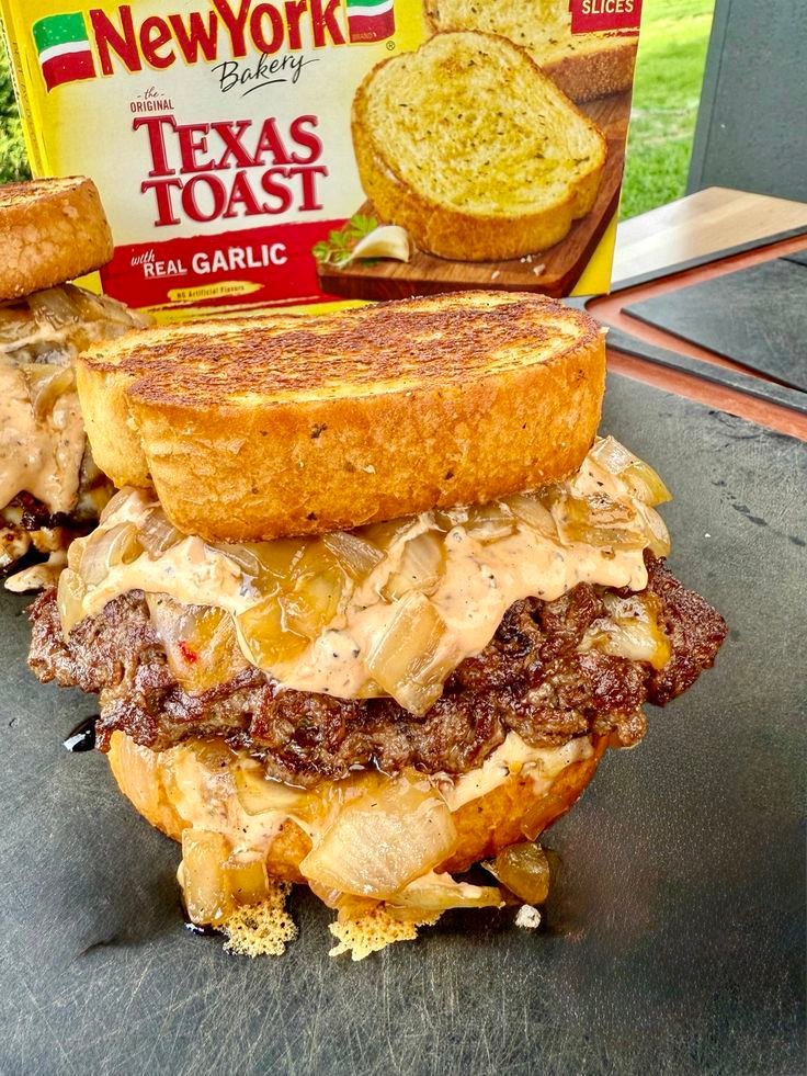 - Add the cooked patty, caramelized onions, and another slice of cheese. Top with the second slice of bread.