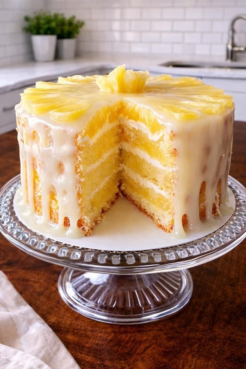 Pineapple cake is a soft, sweet dessert cake flavored with pineapple, often layered with cream and decorated with pineapple slices or chunks.