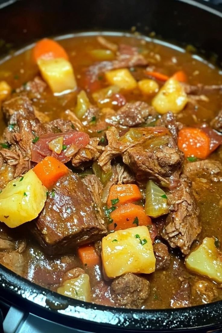 Beef Stew (often called pot beef stew when cooked in one pot) is a hearty dish made by slowly cooking beef with vegetables and broth until everything becomes tender and flavorful. 🍲🥩