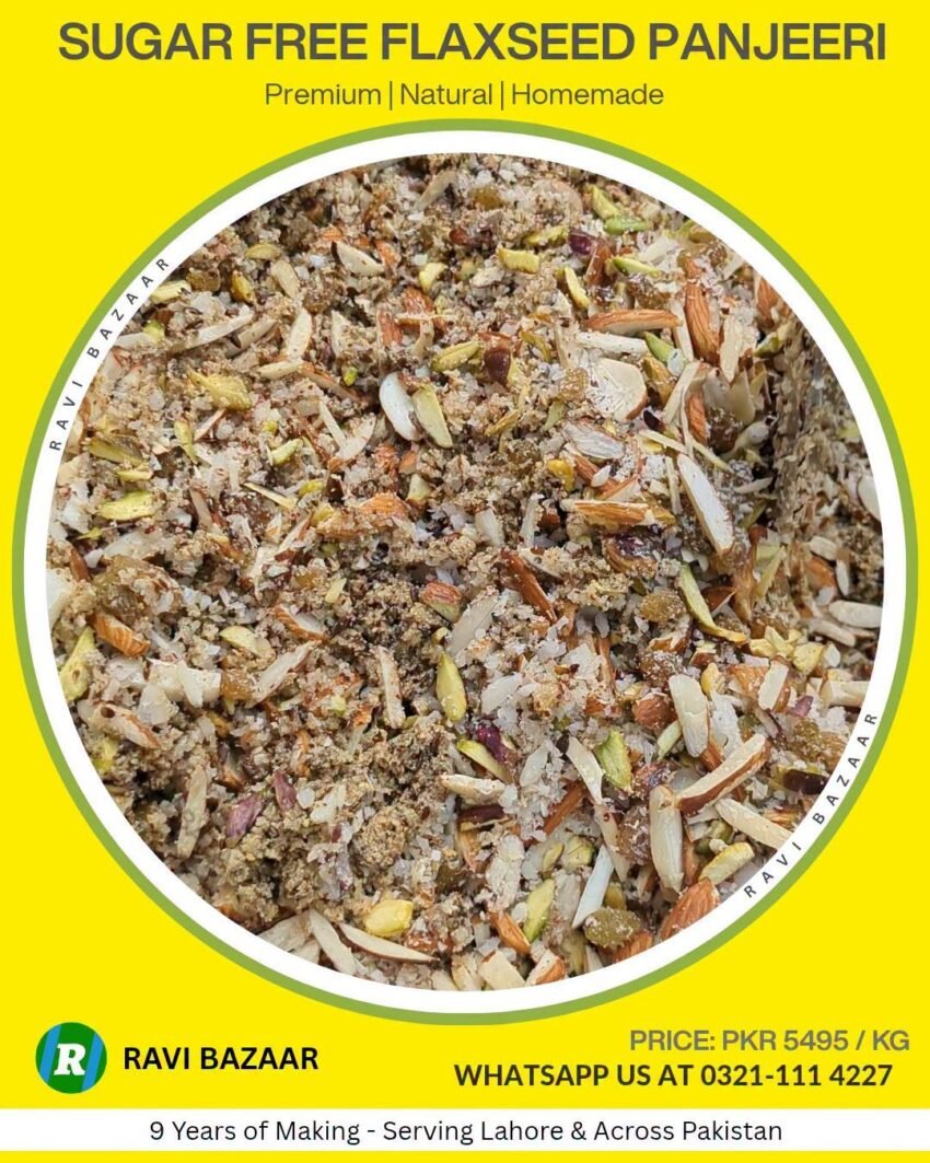 Ravi Bazaar Sugar Free Flaxseed Panjeeri refers to a traditional Pakistani healthy winter sweet (panjeeri / pinni style mix) sold by Ravi Bazaar, but made in a sugar-free variation with flaxseed (alsi).