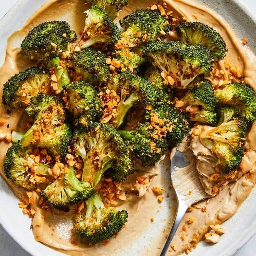 - Creamy tofu balances crispy roasted broccoli