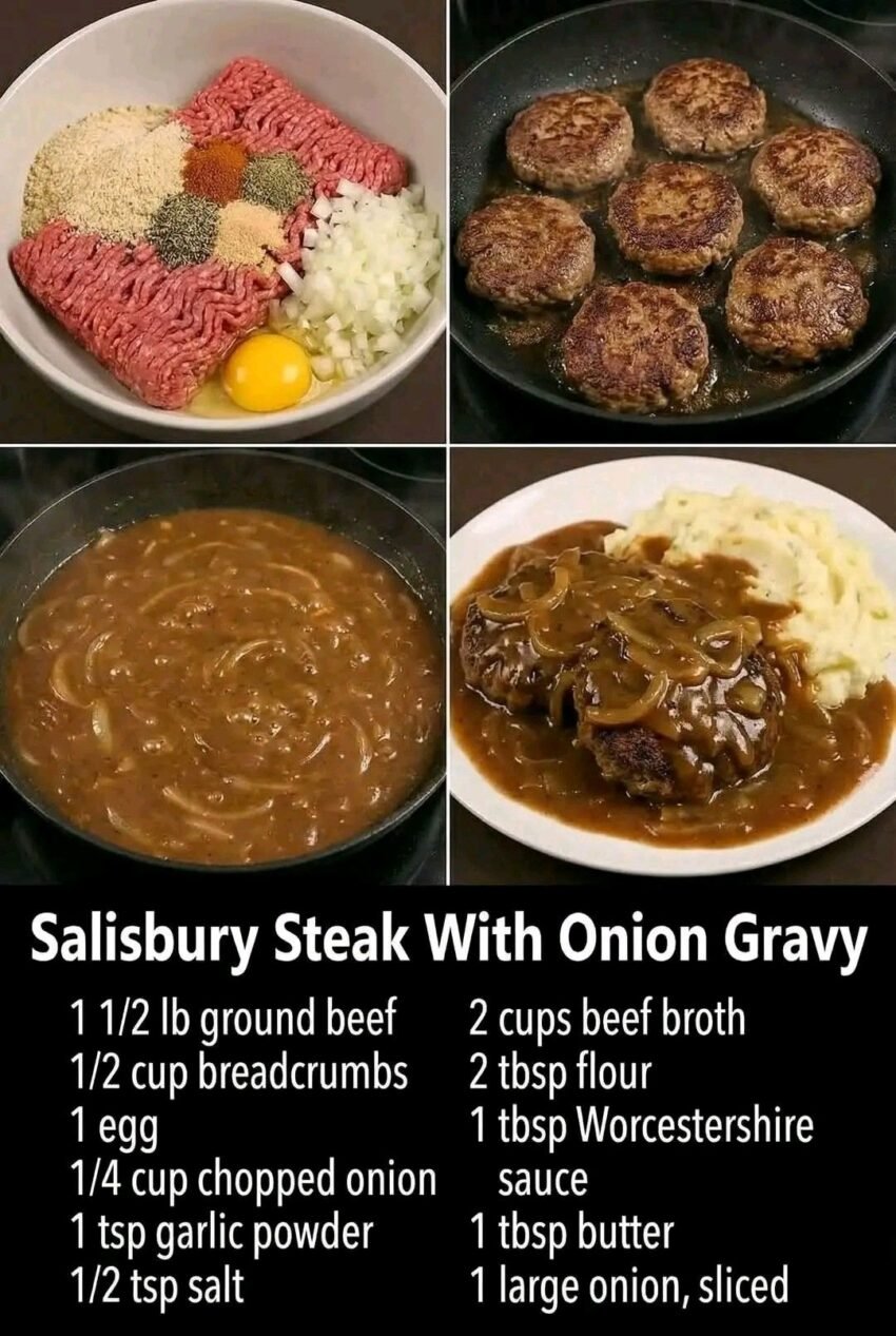 Let’s do it the right way: tender patties, rich onion-mushroom gravy, zero cafeteria vibes.
