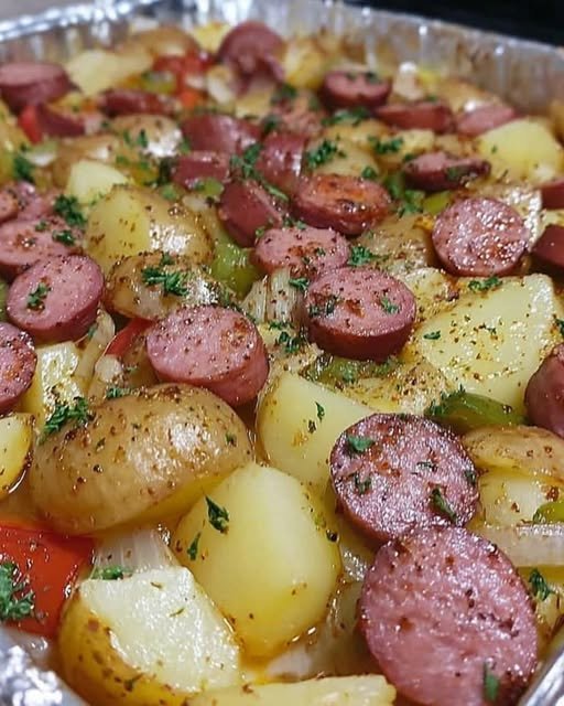 - Repeat layers with remaining potatoes, sausage, and onions.