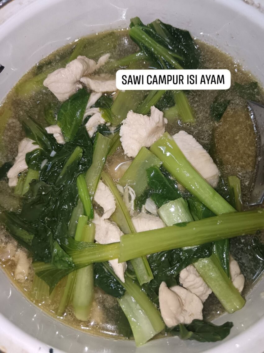Here’s a flavorful Indonesian-style dish: Sawi Campur Isi Ayam — “mixed mustard greens with chicken filling,” a comforting stir-fry often served with rice.