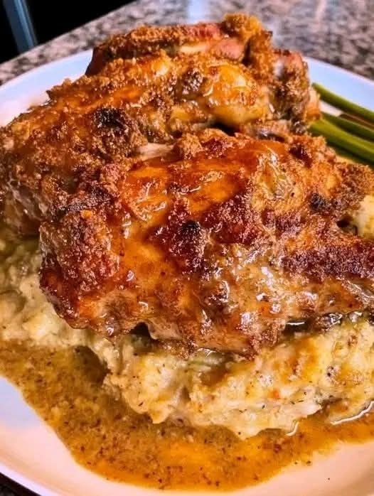 smothered chicken thighs served over a bed of mashed potatoes.