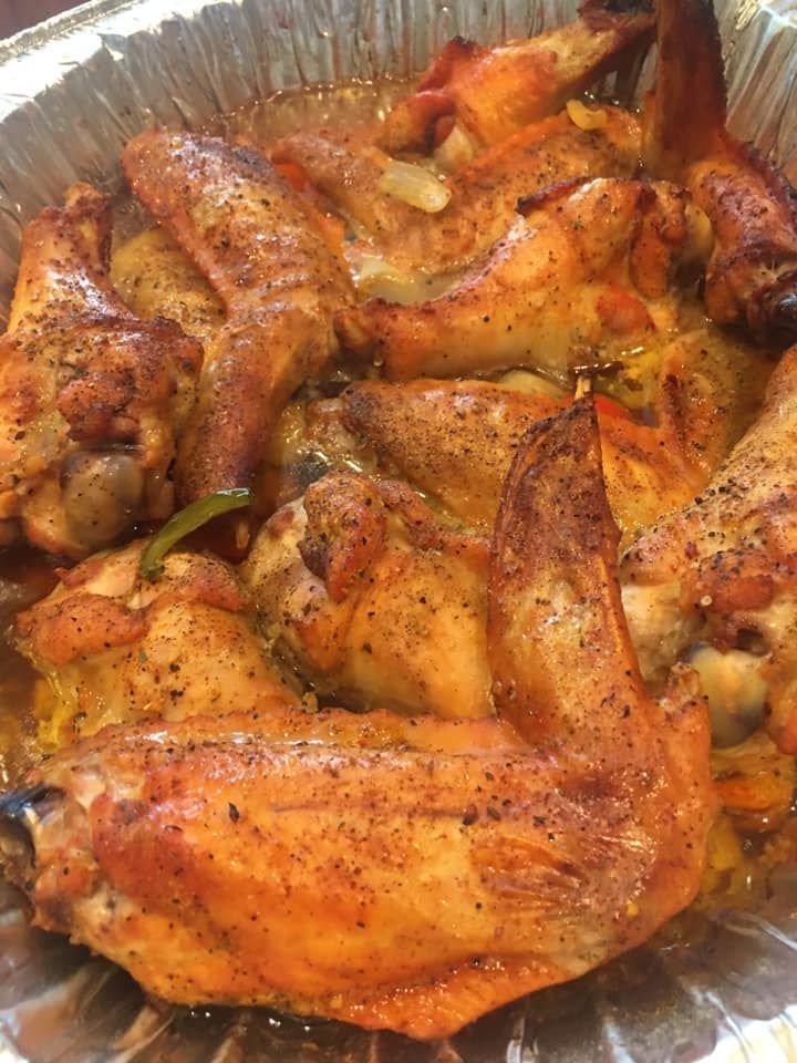 6. Cover with foil or a lid and bake 1.5–2 hours, basting occasionally, until wings are tender and meat pulls easily from the bone.