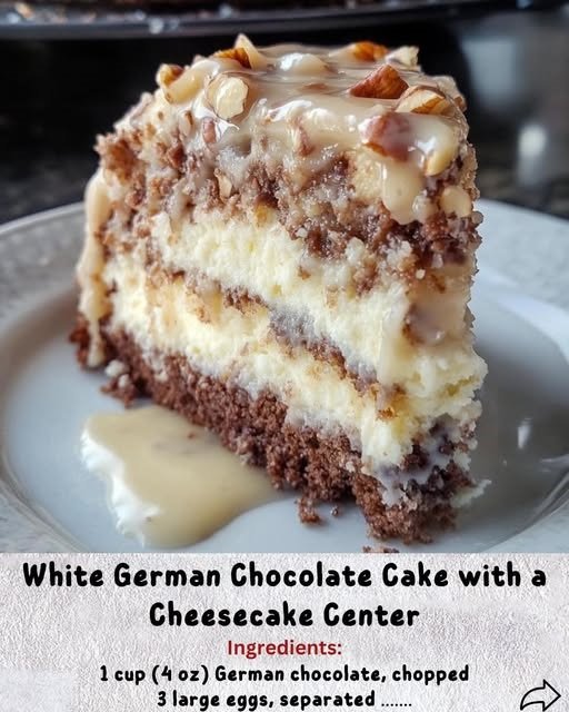 Ah! That’s a showstopper—rich, layered, and decadent. A White German Chocolate Cake with a Cheesecake Center combines the sweetness of German chocolate cake with a creamy cheesecake surprise in the middle. Here’s a detailed recipe: